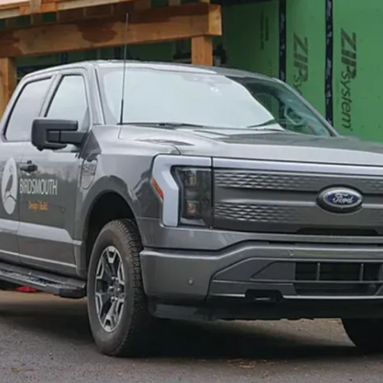 Our design-build firm strives to make our operations as low-impact as our homes. So when we were in need of a new truck, we weren’t interested in purchasing a fossil fuel–powered vehicle. We opted instead for the new Ford F-150 Lightning, one of Ford’s latest offerings in the EV market. It has turned out to be a perfectly capable solution for our company, while also offering benefits beyond what a typical truck can offer.
