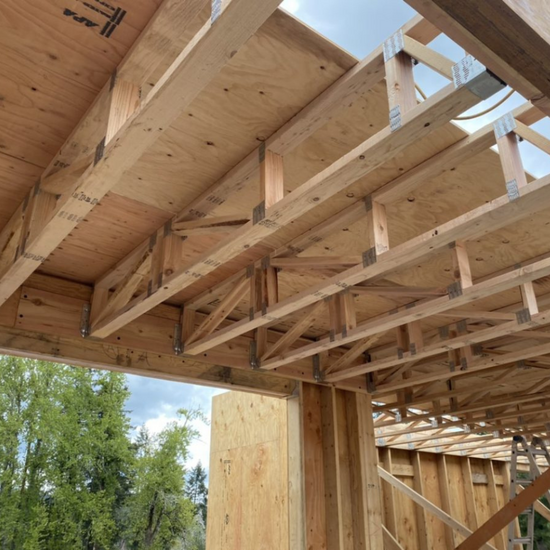 On the top side of this assembly, we create a space within the thermal and air control layers to strategically locate our mechanical, electrical, and plumbing (MEP) systems. We do this by hanging 14-in. parallel chord trusses (PCTs) that we have designed in tandem with our HVAC ducting strategy to have space to distribute the conditioned air. Once the PCTs are hung we simply sheath the topside with plywood, tape the seams and tape them down and over onto the wall sheathing with Siga Wigluv to complete a simple, continuous, and durable air control layer.