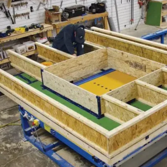 Built in a well-lit, climate-controlled factory, wall, roof, and floor panels are assembled on waist-high tables. Panel construction is based on detailed shop drawings. High-performance panels differ slightly by manufacturer, but generally have 2×4 or 2×6 sheathed structural walls with provisions for air, water, and vapor control. Like the Ecocor walls shown in the photos, the walls on our most recent project used I-joists as Larsen trusses to create an insulation cavity.