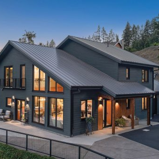 The goal with this home was to create a simple thermal enclosure but maintain a compelling aesthetic. It is simply a box with one top corner clipped off. But look at the finished home and you will see a garage that is set back from the main home’s massing, two separate elevations for the roofline, a covered front porch, plenty of windows, and a balcony overlooking the river.