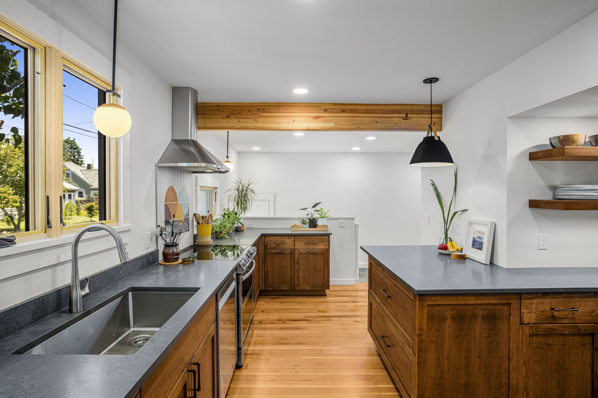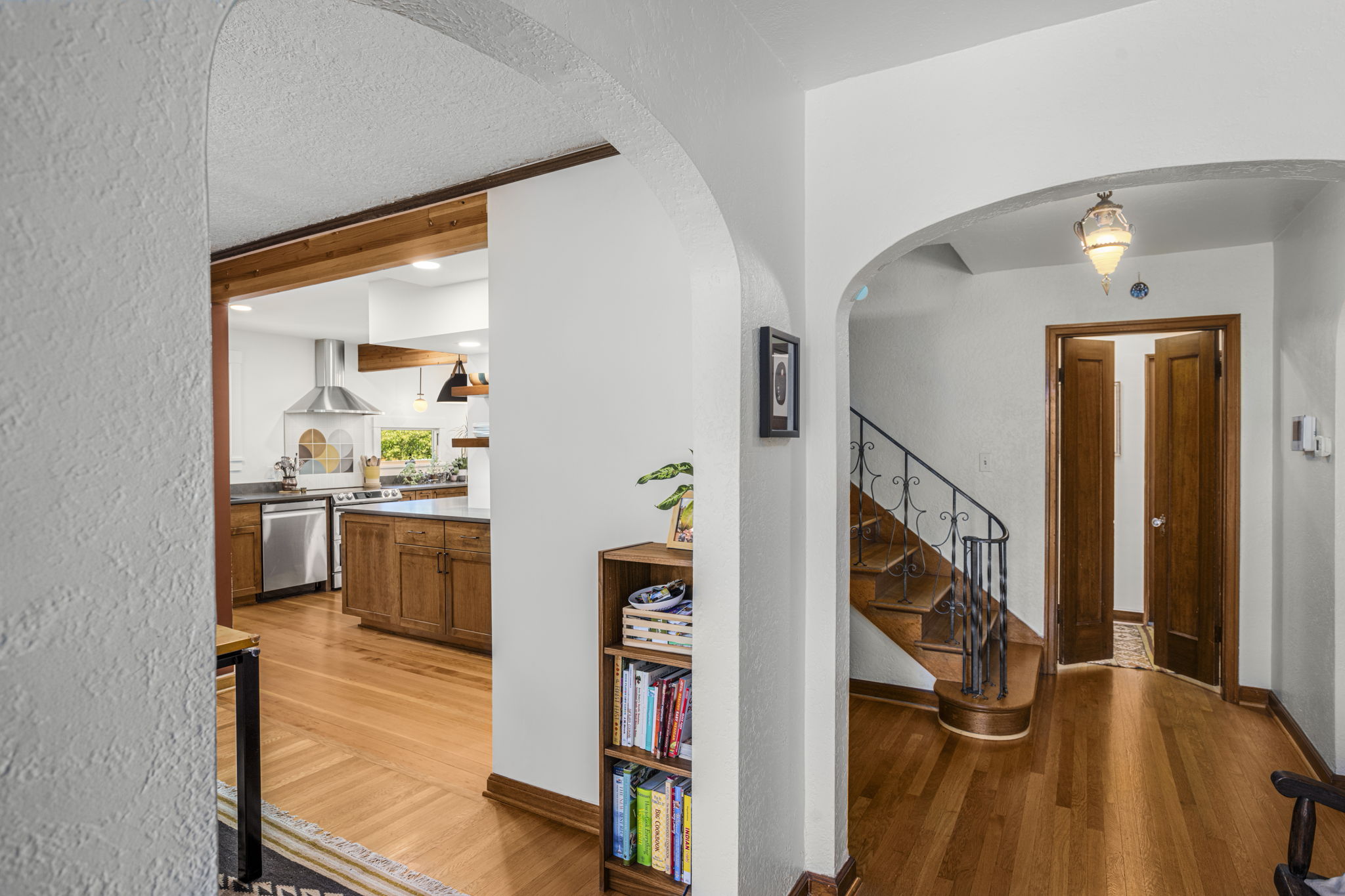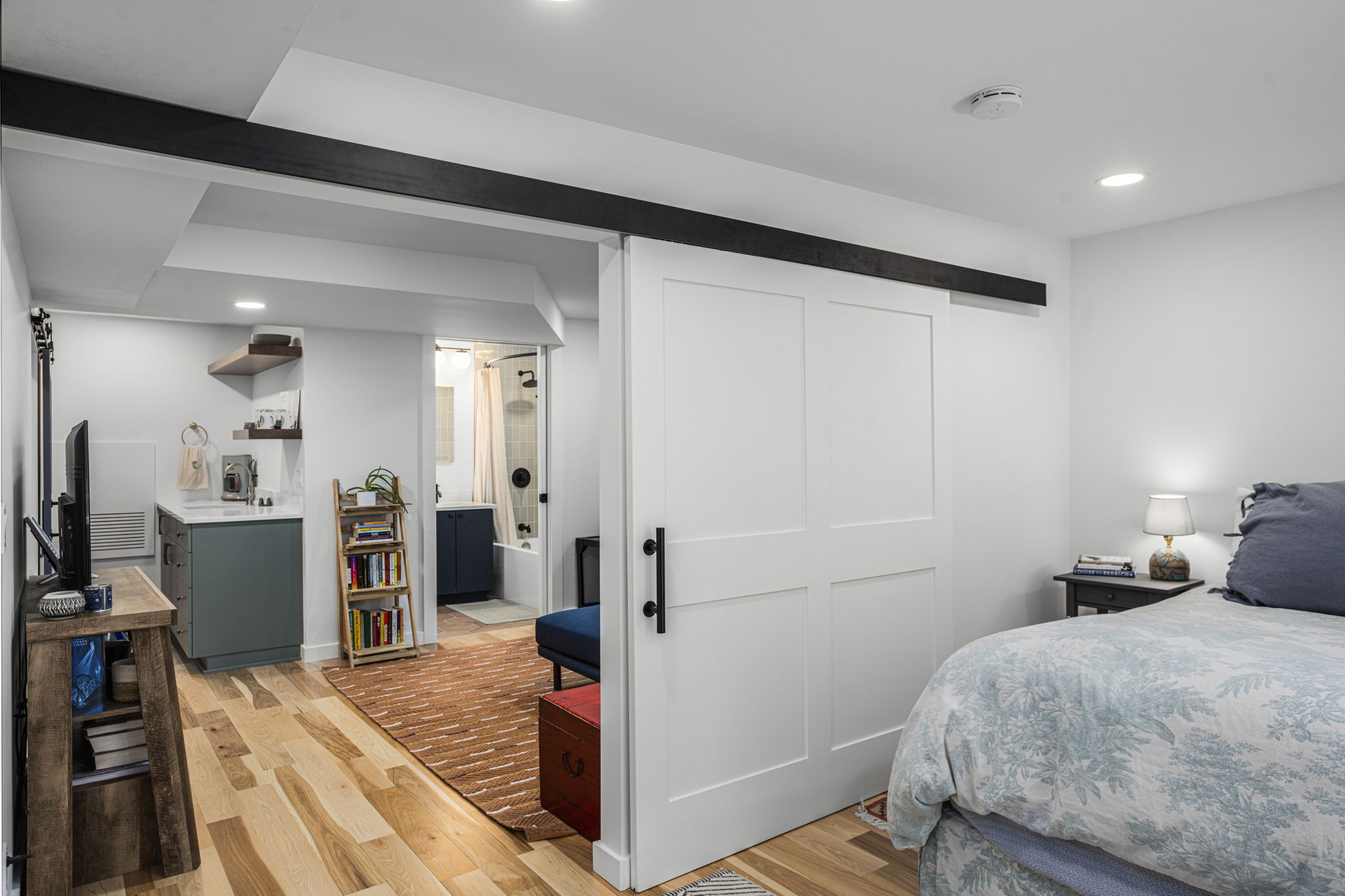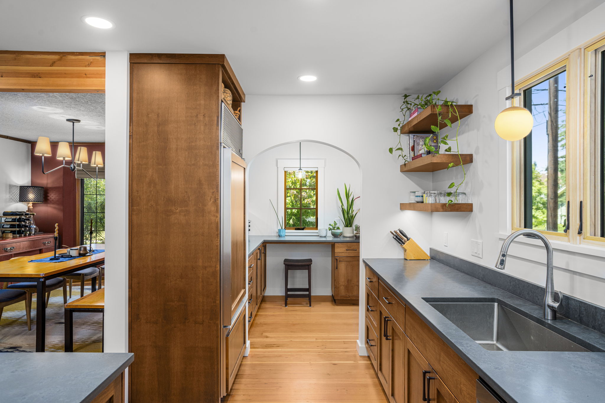 Transforms a tight and inefficient kitchen into an open kitchen that offers through-views from several directions, various coffee and seating nooks, a comfortable mud entry, and a vibrant outdoor connection to neighbors walking by. A full basement conversion into living space includes a new bathroom and coffee bar, and reorients to the stairs to thoughtfully create privacy between visiting houseguests in the basement and the main home above. Deep egress window wells wash the basement in light, and wide barn doors facilitate a larger continuous living space when left open, while providing flexibly and maximum privacy for overnight guests when closed.