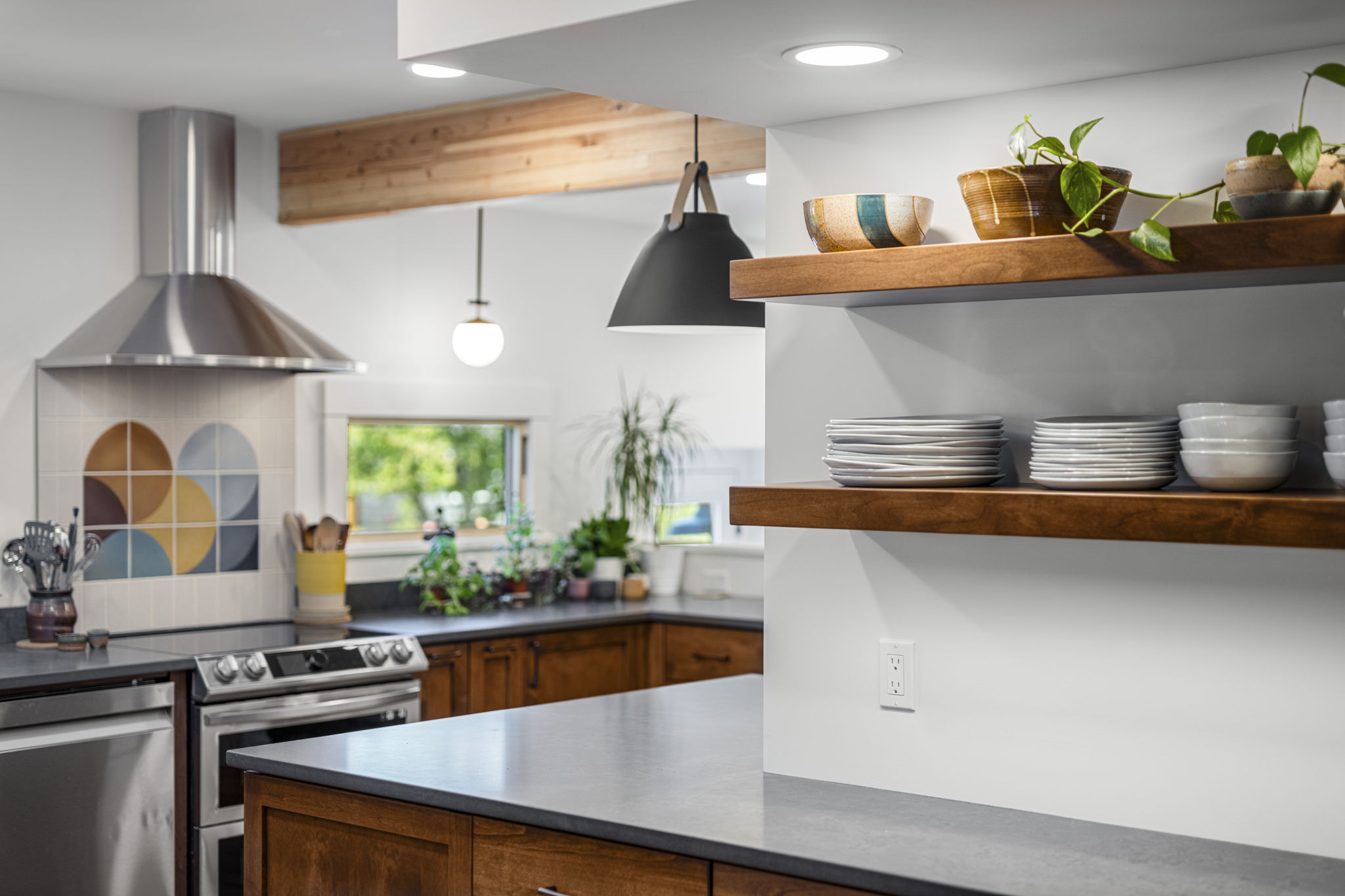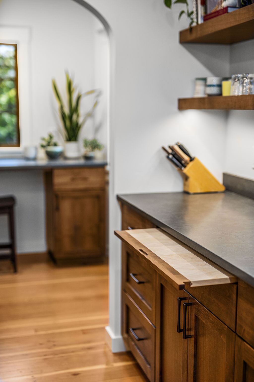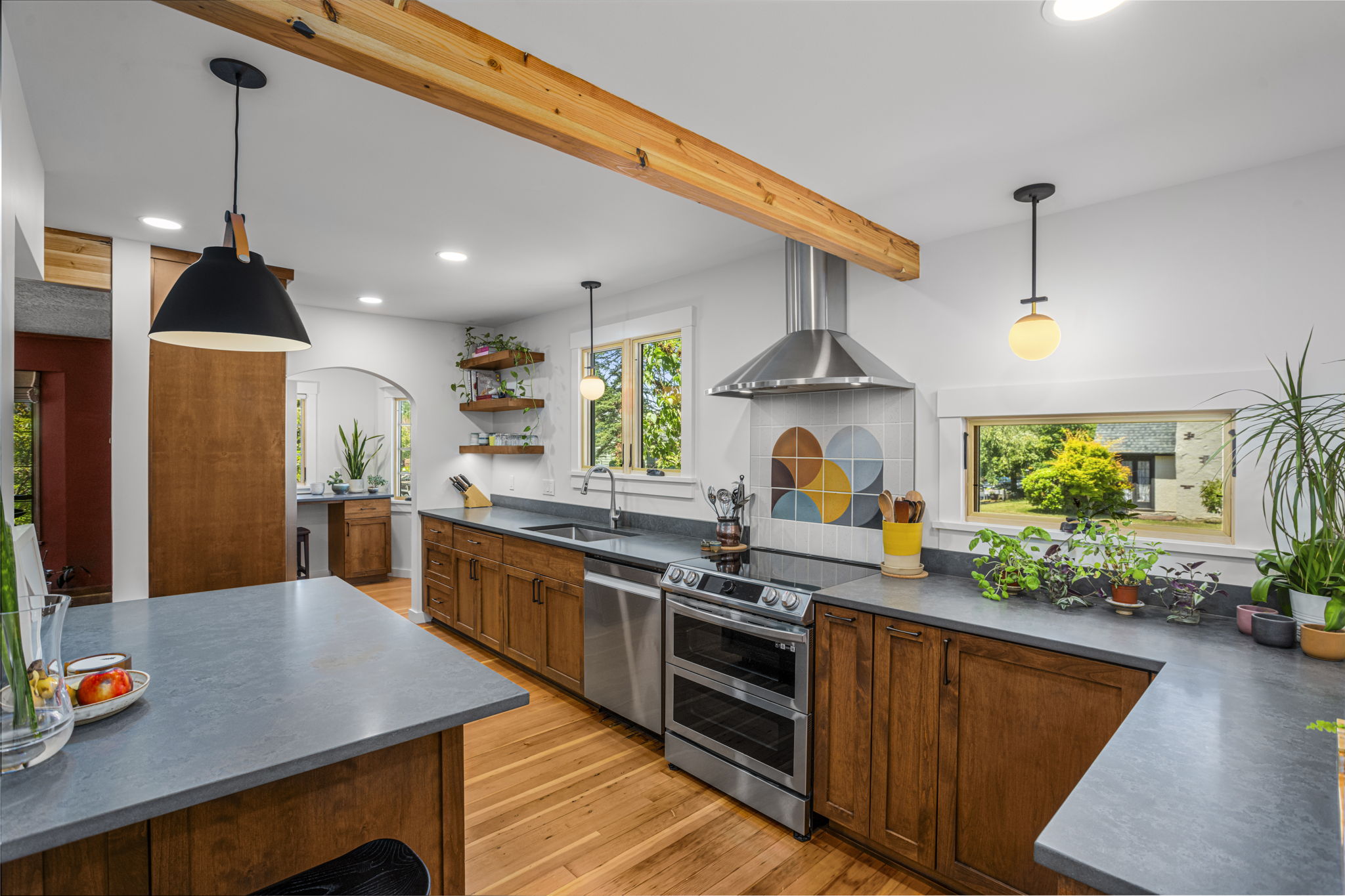 Transforms a tight and inefficient kitchen into an open kitchen that offers through-views from several directions, various coffee and seating nooks, a comfortable mud entry, and a vibrant outdoor connection to neighbors walking by. A full basement conversion into living space includes a new bathroom and coffee bar, and reorients to the stairs to thoughtfully create privacy between visiting houseguests in the basement and the main home above. Deep egress window wells wash the basement in light, and wide barn doors facilitate a larger continuous living space when left open, while providing flexibly and maximum privacy for overnight guests when closed.