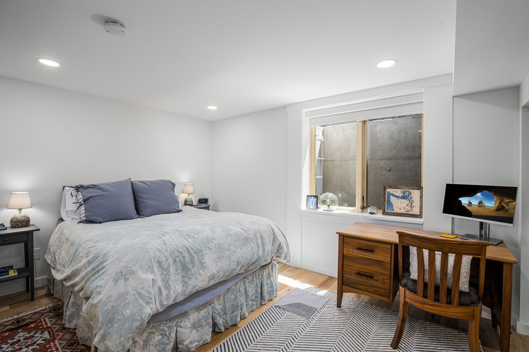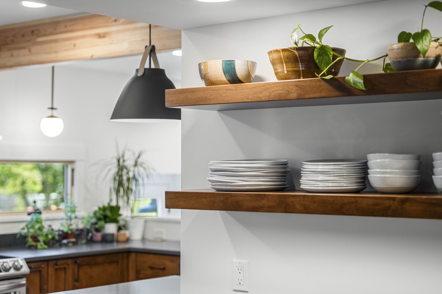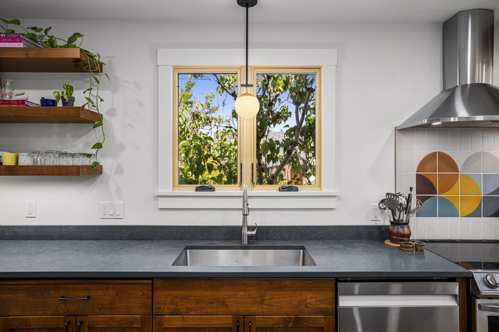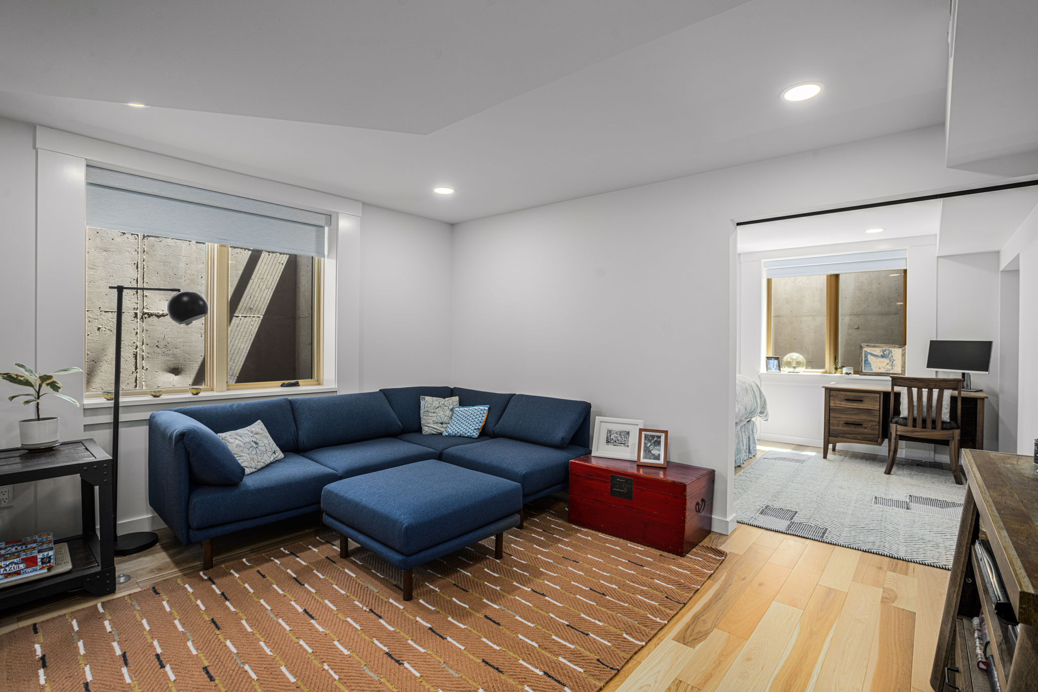 Transforms a tight and inefficient kitchen into an open kitchen that offers through-views from several directions, various coffee and seating nooks, a comfortable mud entry, and a vibrant outdoor connection to neighbors walking by. A full basement conversion into living space includes a new bathroom and coffee bar, and reorients to the stairs to thoughtfully create privacy between visiting houseguests in the basement and the main home above. Deep egress window wells wash the basement in light, and wide barn doors facilitate a larger continuous living space when left open, while providing flexibly and maximum privacy for overnight guests when closed.