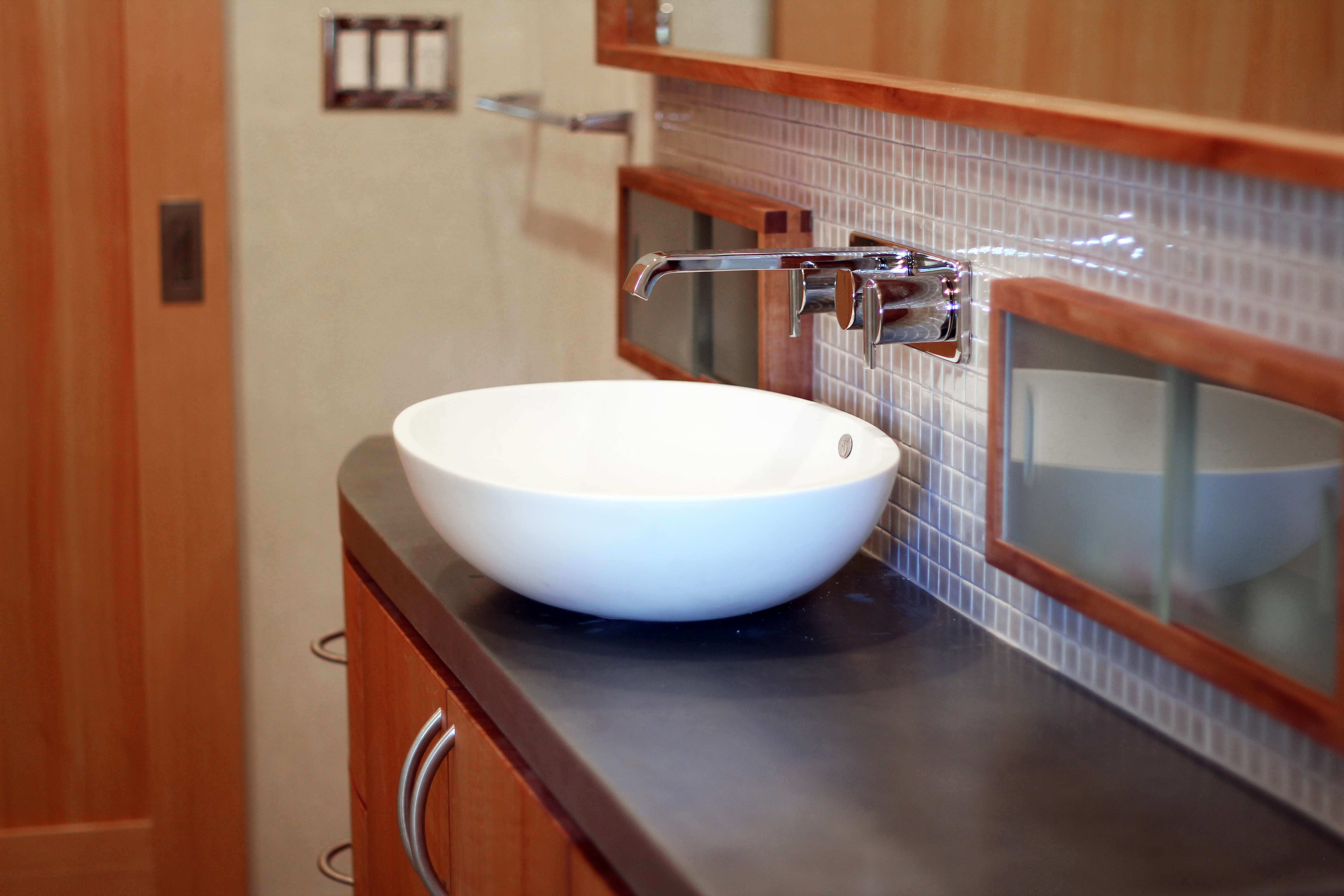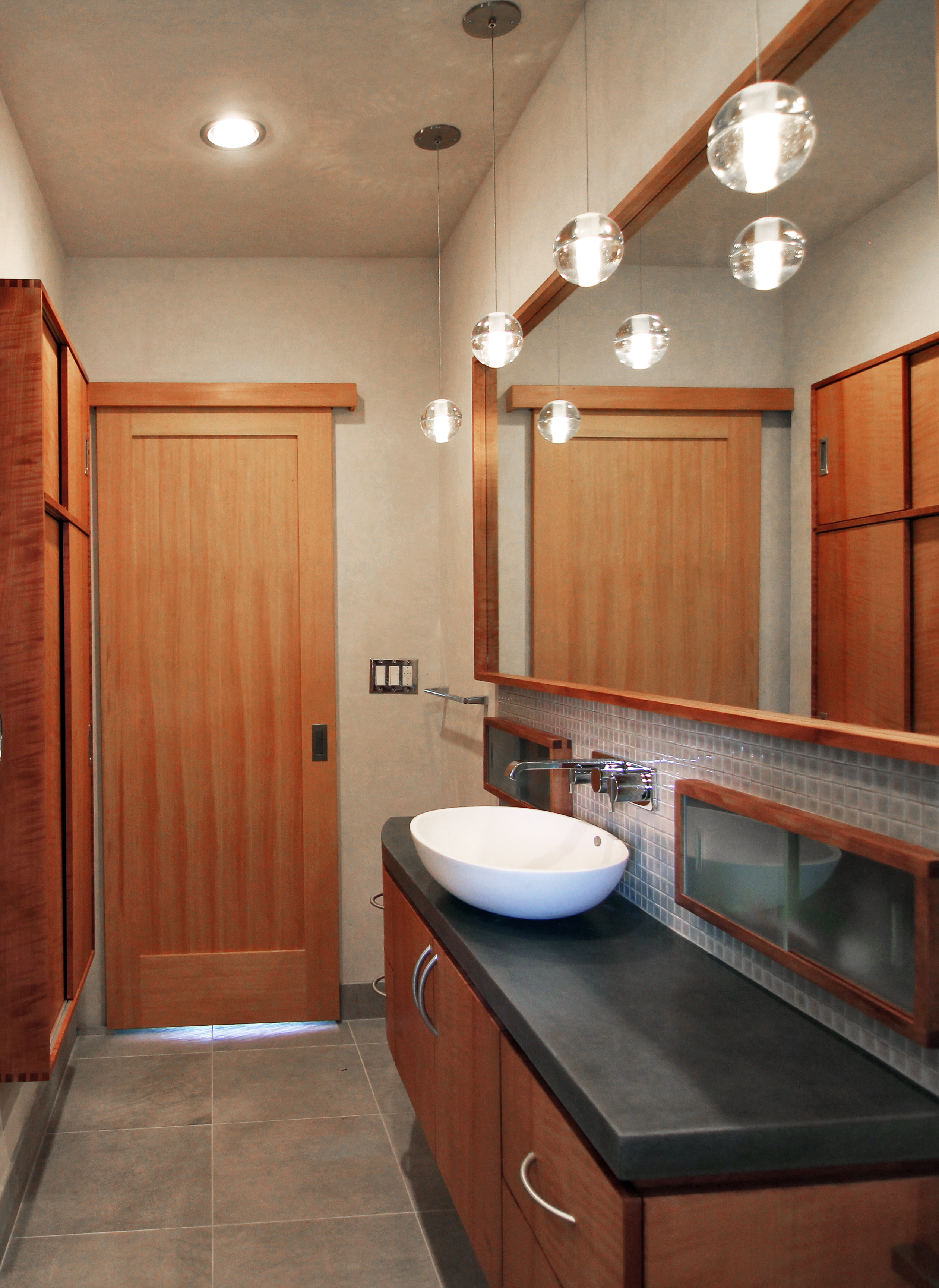 This small bath was completely gutted, and all new plumbing and electrical was added. The footprint of this bath is 4' x 9' with a small shower area. With a wall mount toilet, floating cabinet, built in storage cabinet, glass shower enclosure and large mirror the room feels spacious. All the cabinetry is local, handcrafted madrone and the walls are finished with an American Clay plaster. The sliding fir pocket door and rail hides the door behind the built in and allows for better use of space and a new, larger window was added for connection to the backyard and natural light.